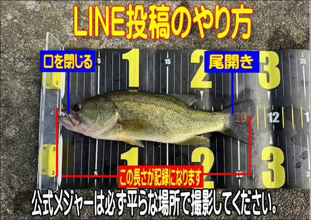 バスが釣れたら測定する前にメジャーを水に浸してください。バスに極力、ダメージを与えないためにもご協力ください。